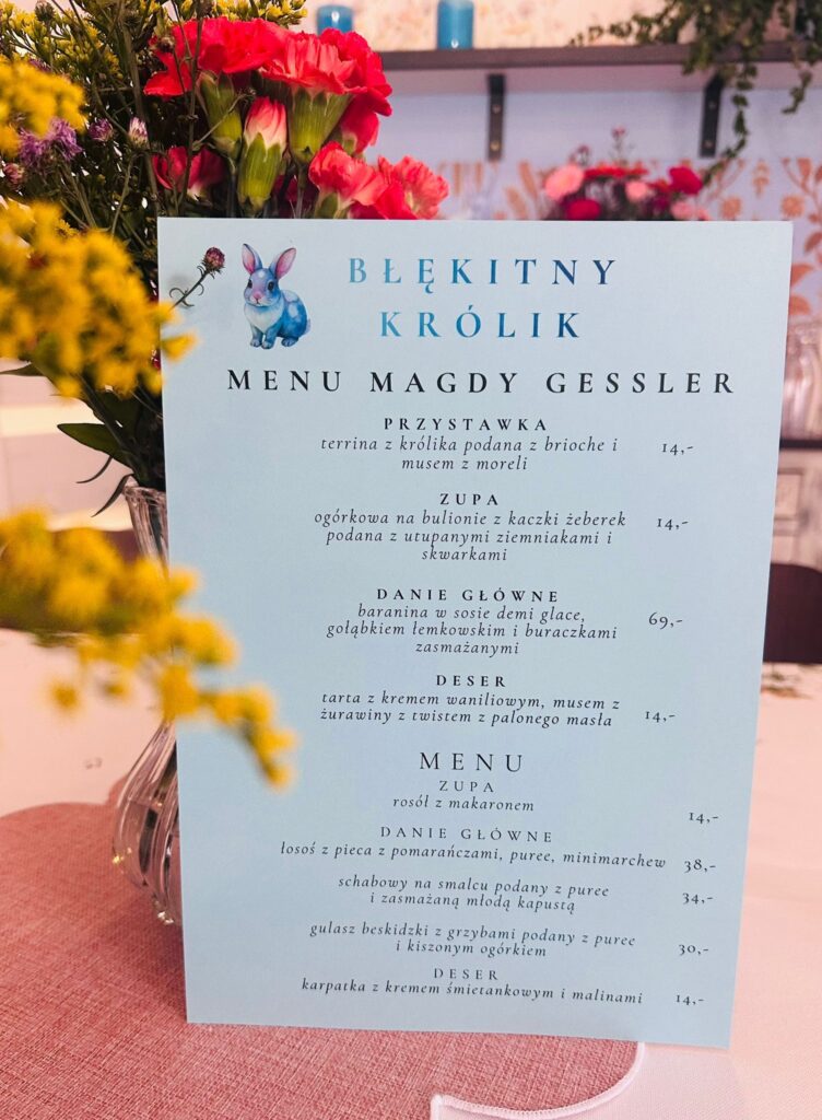 Restauracja Błękitny Królik to miejsce, które łączy tradycyjną kuchnię polską z autorskim sznytem znanej restauratorki, Magdy Gessler(restauracja w trakcie Kuchennych Rewolucji). Stawiamy na wysokiej jakości regionalne składniki i klasyczne receptury w nowoczesnym wydaniu.
